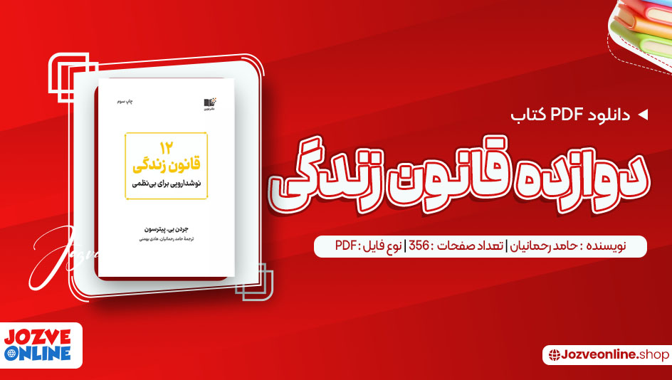 دانلود کتاب دوازده قانون زندگی حامد رحمانیان 356 صفحه PDF📘،جردن پیترسون در کتاب 12 قانون زندگی؛ نوشدارویی برای بی نظمی، با دیدگاهی کاملا متفاوت نسبت به داستان های اساطیری، تاریخ، علم، روانشناسی و تجربیات کاری خودش و با بهرهگیری از مطالعات وسیعش در انواع رشتههای مختلف، میکوشد، چگونه زندگی کردن را به ما بیاموزد.